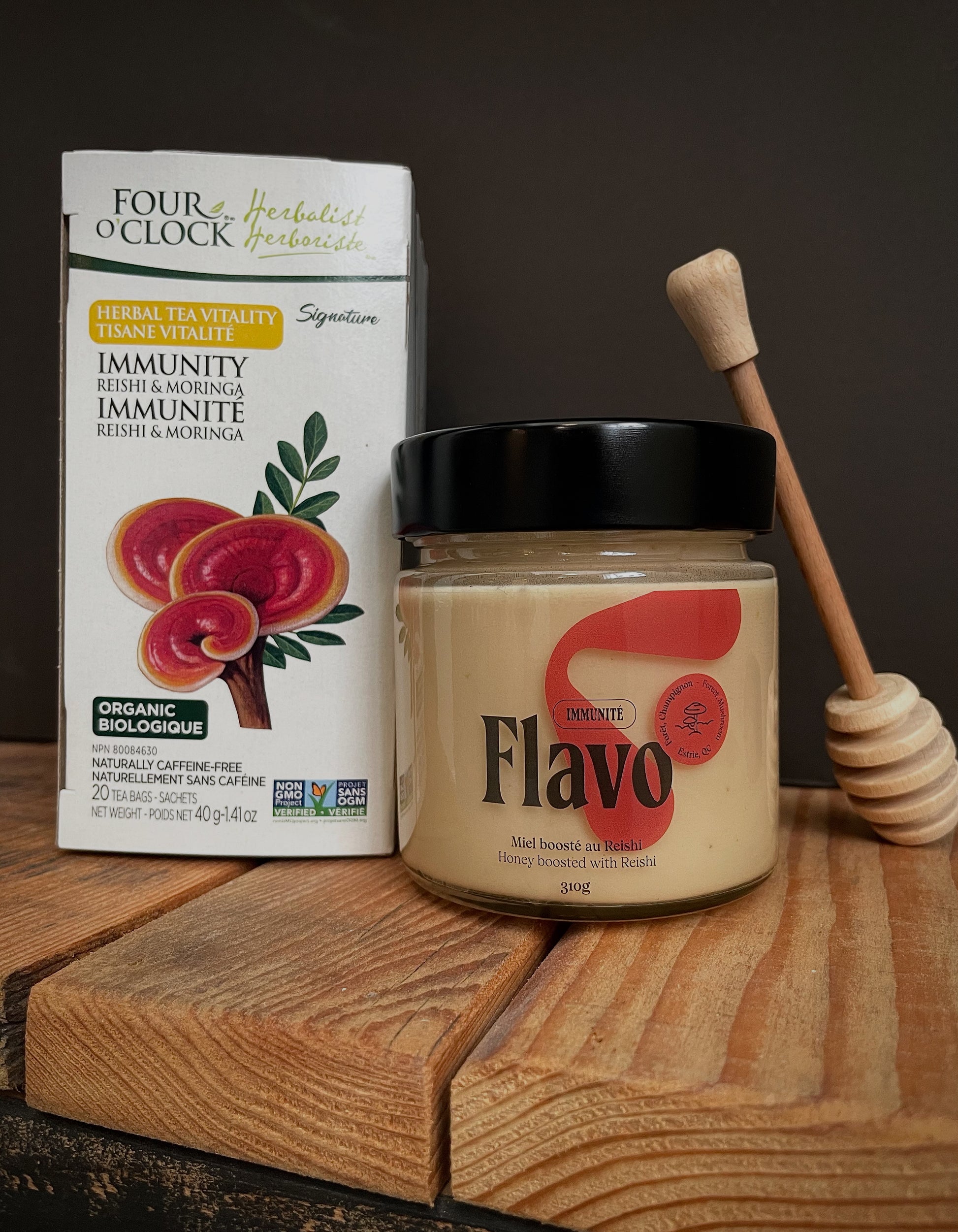 Ce duo comprend une boîte de tisanes (20 sachets) au reishi et moringa. Ce champignon et cette plante ont d'excellentes propriétés pour soutenir le système immunitaire. Pareillement, notre miel boosté au reishi est super pour donner un petit coup de main à son système immunitaire. Parfait pour les périodes plus froides et lorsque les virus circulent.