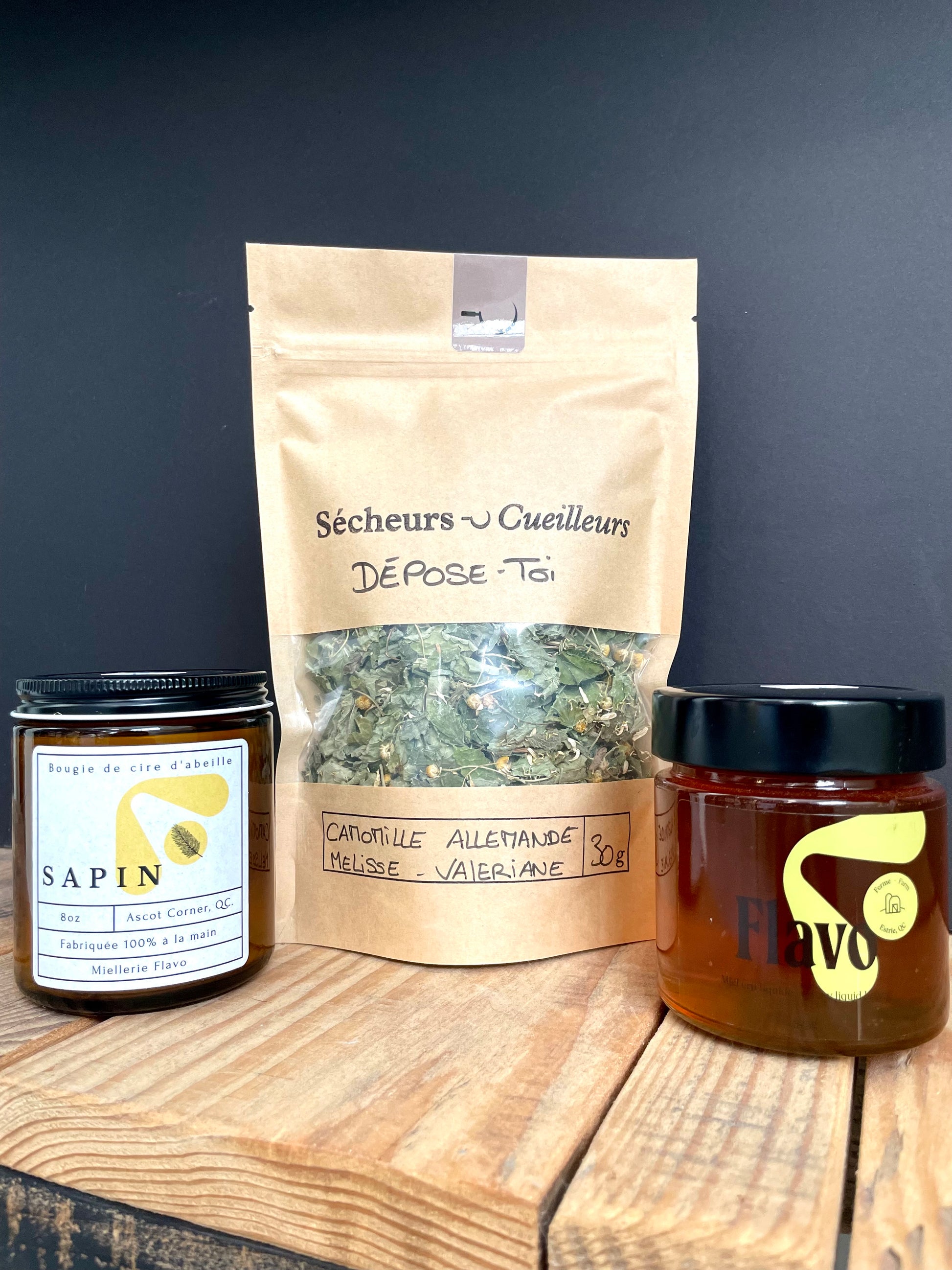 Nous vous proposons un ensemble réconfortant comprenant une chandelle au sapin fabriquée 100% à la main avec notre cire d'abeille naturelle, un pot de miel liquide Flavo, ainsi qu'une tisane «Dépose toi» de Sécheur Cueilleurs!