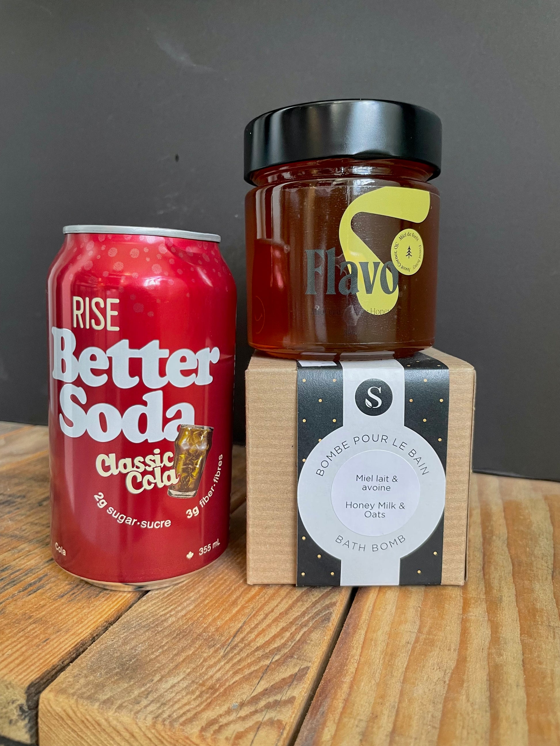 Ce kit inclus un pot de miel liquide flavo, une bombe pour le bain signée Savonnerie Sapponaria, ainsi qu'un «coke» franchement meilleur pour la santé; Rise Better Soda Cola (2g de sucre, 3g de fibres).